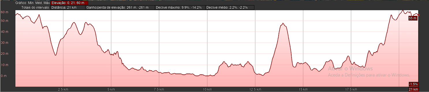 A meia maratona tem a distância de 21,097 Km e tem início às 09:45 horas.